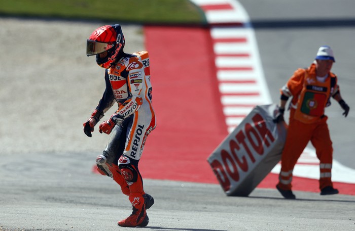 Martin sempat menyalip Marquez di tikungan ketujuh. Marquez terlihat memaksakan lajunya sehingga berujung terseret di lintasan.