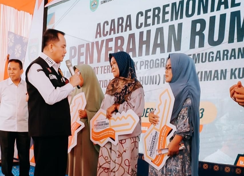 Agus Fatoni secara simbolis menyerahkan kunci kepada masyarakat terdampak yang berada di Lorong Lama, Kelurahan Bagus Kuning Plaju, Palembang, Sumatera Selatan, pada Minggu, 3 Desember 2023.