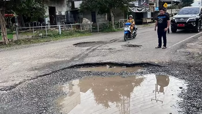 Kondisi jalan itu berlubang dan makin melebar. Ruas jalan itu kerap dilalui kendaraan bermuatan berat, ditambah lagi adanya genangan air dari guyurun hujan. Akibatnya, pengendara motor dan mobil yang melintas kerap mengeluh karena kondisi jalan makin rusak parah. Jalan yang rusak dengan panjang dari 1,5 meter hingga 2,5 meter.