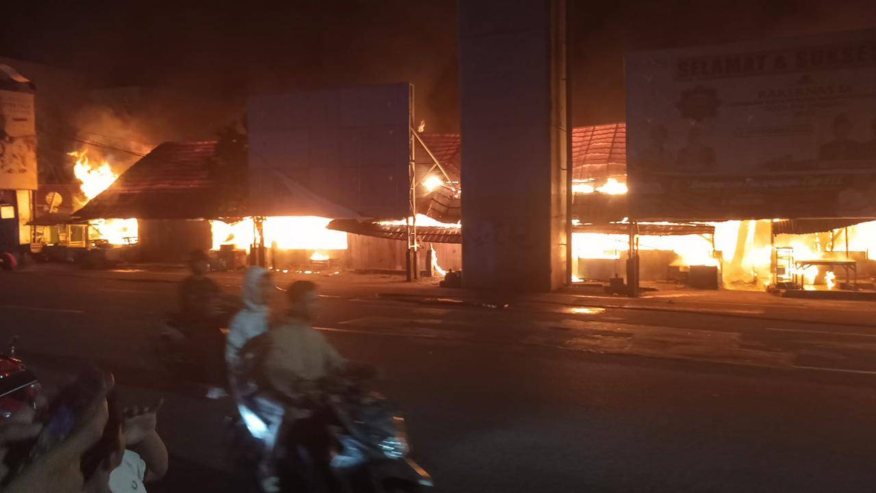 Kebakaran melanda kawasan Pasar Cinde di Jalan Jenderal Sudirman, Kecamatan Ilir Timur I, Palembang. Puluhan kios semi permanen milik pedagang pun hangus dalam musibah ini.