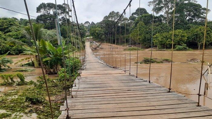 TRIBUNSUMSEL.COM, BATURAJA — Jembatan gantung Desa rantau Kumpai Kecamatan Sosoh Buay Rayap Kabuapten Ogan Koemering Ulu yang sempat terendam banjir kini sudah bisa dilewati, Minggu (18/2/2024) .