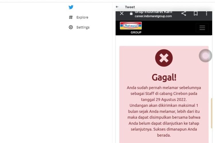 KOMPAS.com – Sebuah cuitan yang mempertanyakan perihal melamar kerja di Indomaret hanya bisa dilakukan sekali seumur hidup, ramai di media sosial. Unggahan itu dibuat oleh akun Twitter ini pada Jumat (2/6/2023). Dalam twit itu, tampak tangkapan layar dari website Indomaret Grup yang tertulis bahwa pengunggah gagal karena sebelumnya sudah pernah melamar di Indomaret.